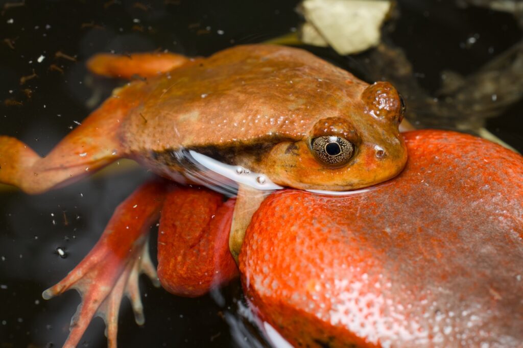 トマトガエルの面白い性質として、近隣に保護区や国立公園があるにもかかわらず、街の中の排水溝などで見つけやすいということがあります。理由は、トマトガエルのオタマジャクシが生きるために必要なバクテリアが、人間が使用した排水に多く含まれているためです。ですので、こんなに綺麗なカエルですが、実際に探すのは街中になります。