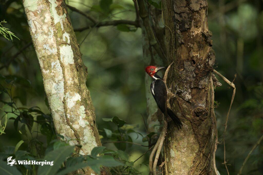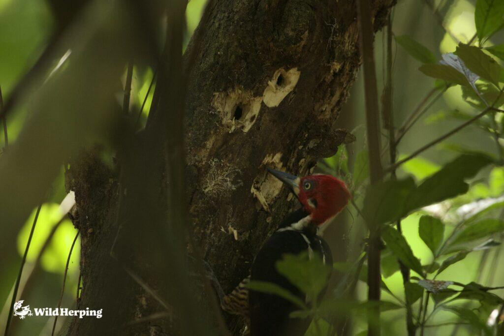 現地のガイドさんも驚きの、Crimson-crested woodpeckerです。通常、木の高いところで生活する彼らですが繁殖期の真っ只中でオスがメスにプレゼントする餌の確保に夢中で人間など目にくれず餌を探すのに必死です。おかげで非常に近距離で撮影することができました。