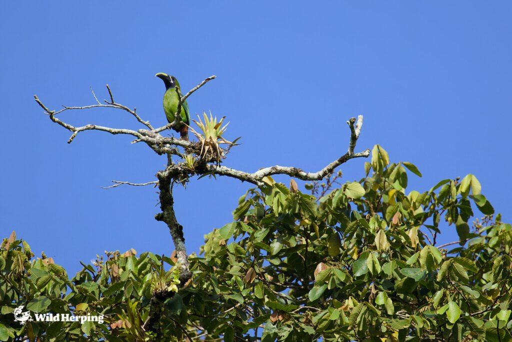 The Northern Emerald Toucanet (Aulacorhynchus prasinus) is another species that is relatively easy to observe in this region. In addition to fruits and berries, it is also known to prey on small birds such as hummingbirds. Because these toucanets tend to roost in the same area each evening, we searched for them toward dusk.