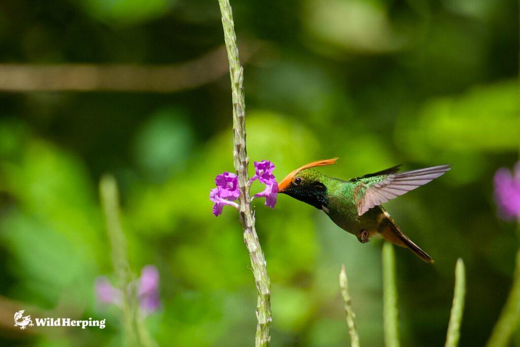 One of the main target species was the Rufous-crested Coquette (Lophornis delattrei). As this species rarely visits feeders, we searched for territorial males while walking through the forest. On several occasions, we were fortunate enough to observe individuals visiting flowers to feed on nectar.