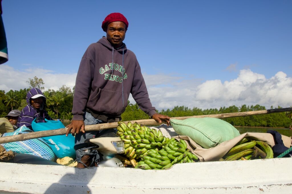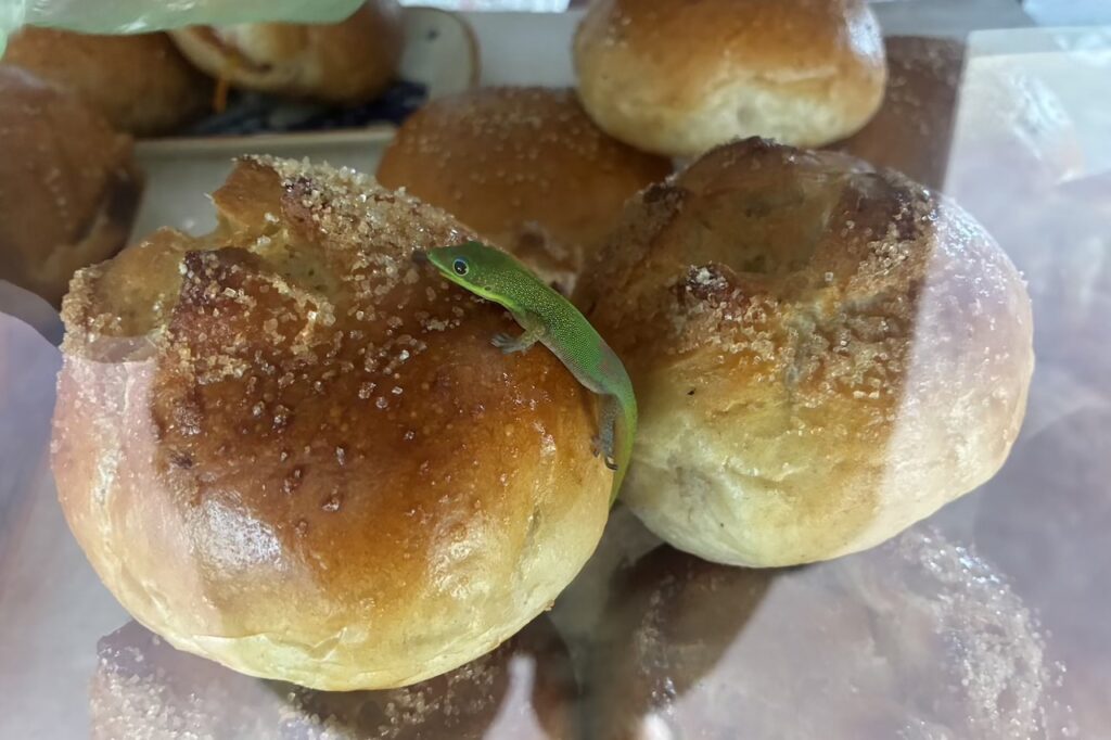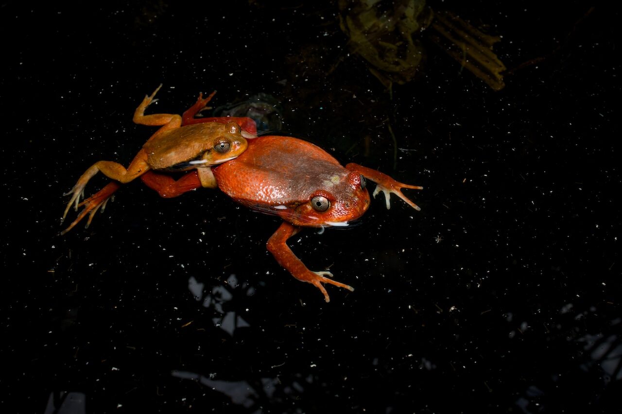 町のパン屋にはヒルヤモリが砂糖を舐めにきます 裏庭には、真っ赤なトマトガエルがいます バナナとバイクを船で運びます ヒメハリテンレックも村人の裏庭で探します