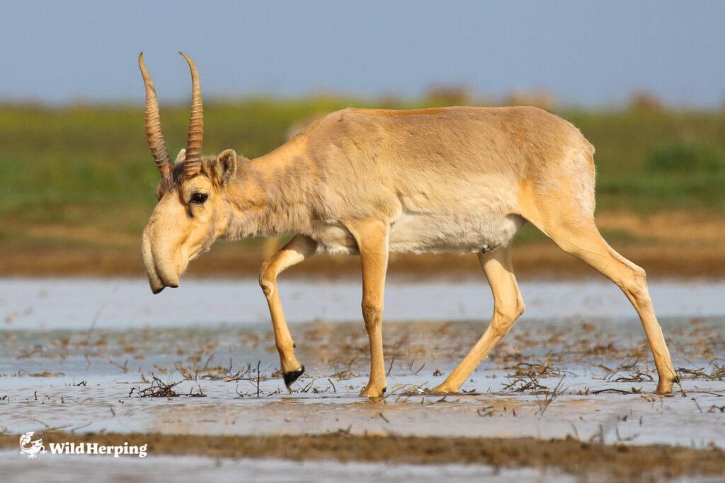 サイガ・・・氷河期から姿を変えず生き抜いた「生きた化石」サイガ。ゾウのような鼻を持つその異形な姿は、モンゴルの大平原でも滅多に出会えない絶滅危惧種です。冬の間は、餌を求めて標高を下げるため観察確率を最大限に高めることができます。